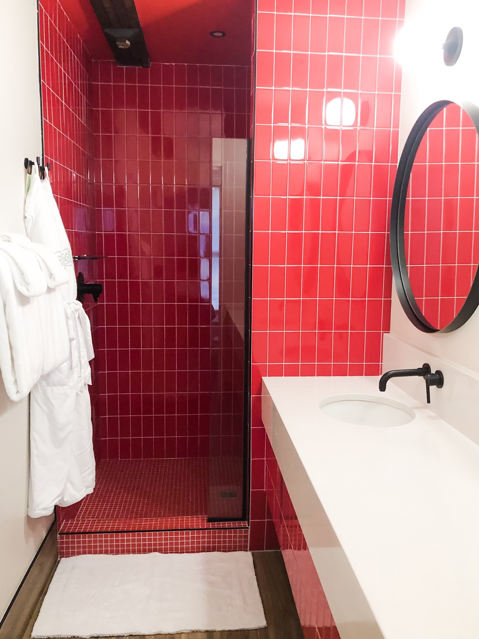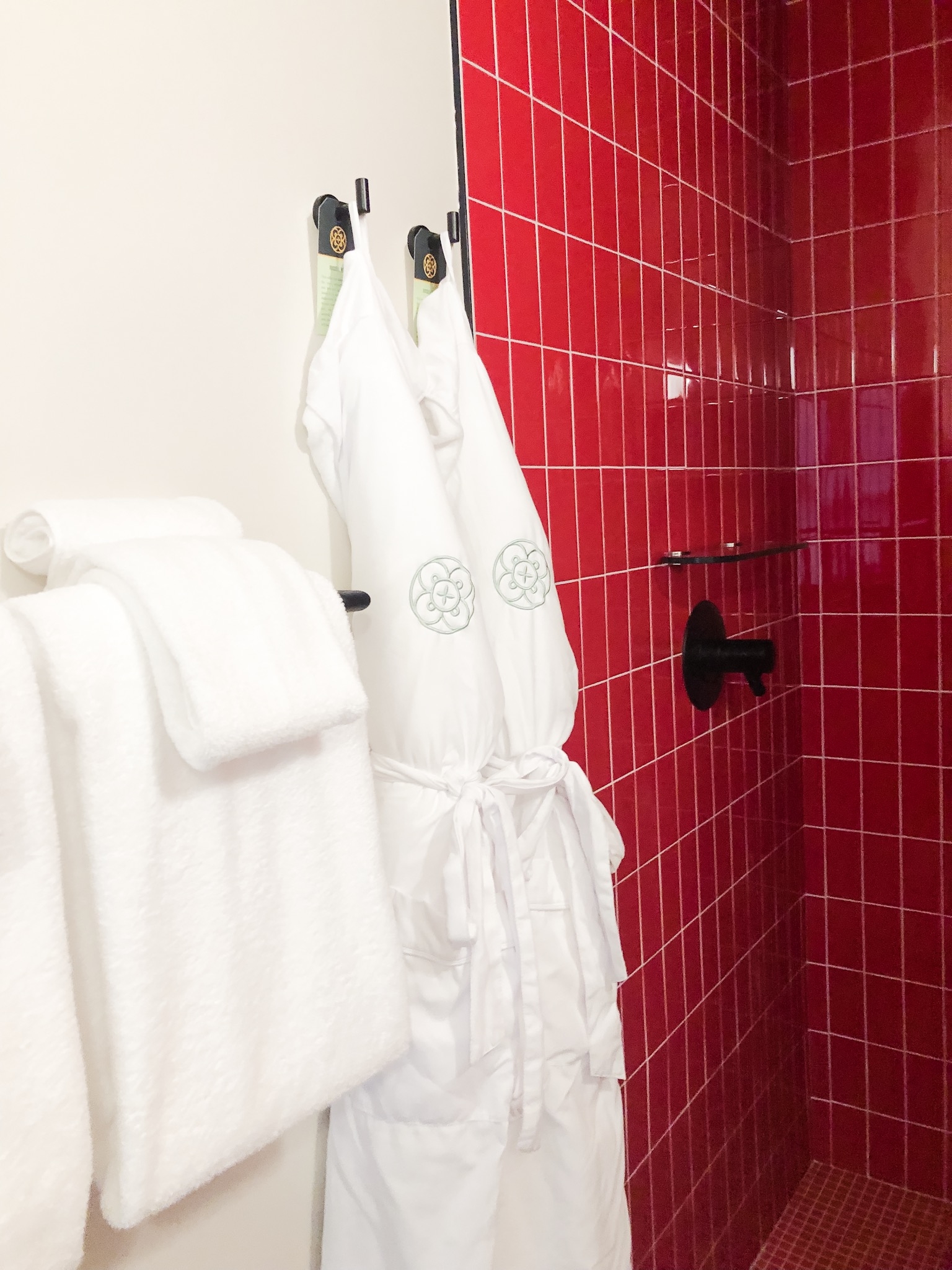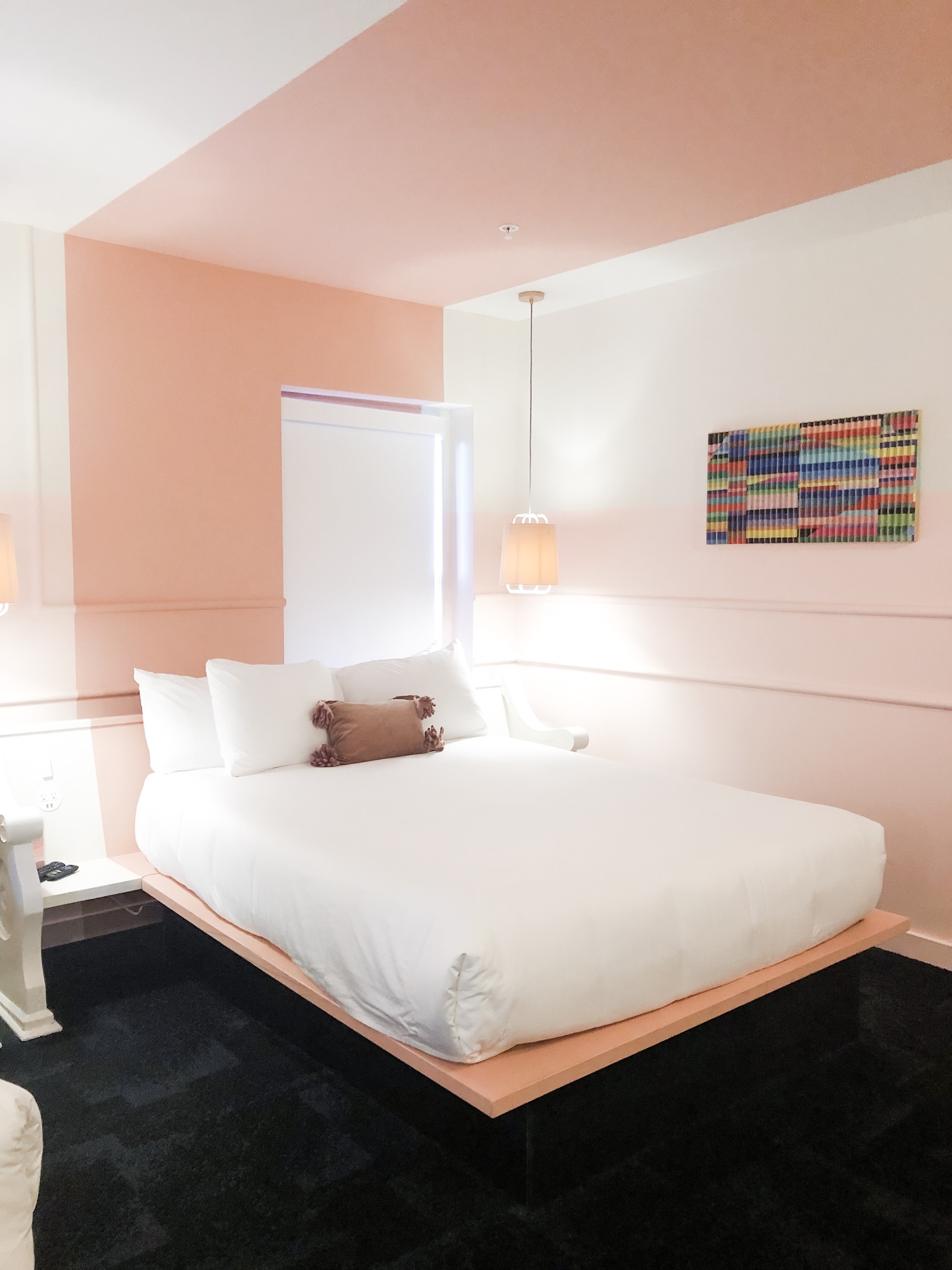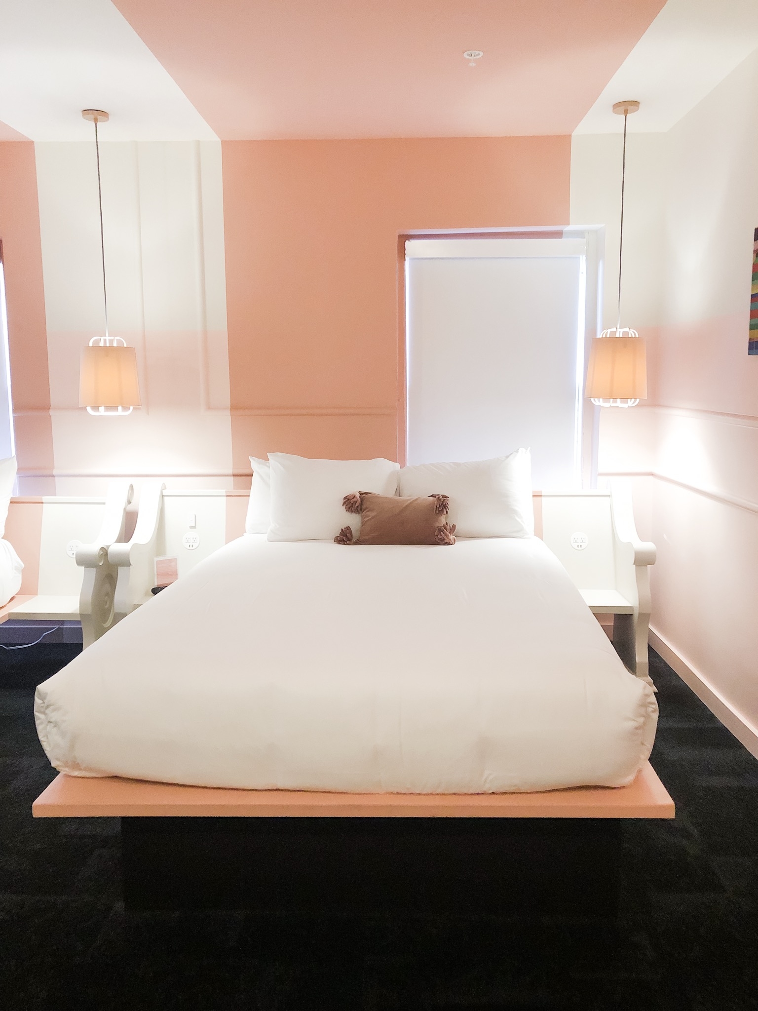 Our room was huge! There was plenty of space for both of us (and all our luggage ;)). We stayed in Room 2:6, a double queen + twin sleeper sofa room. The pink walls and cute red bathroom won me over immediately. Britt and I loved all the unique touches like the headboards made from the church’s original pews, a goodie basket with local snacks, and a visitor’s guidebook that was filled with recommendations for local restaurants, nightlife, and more.