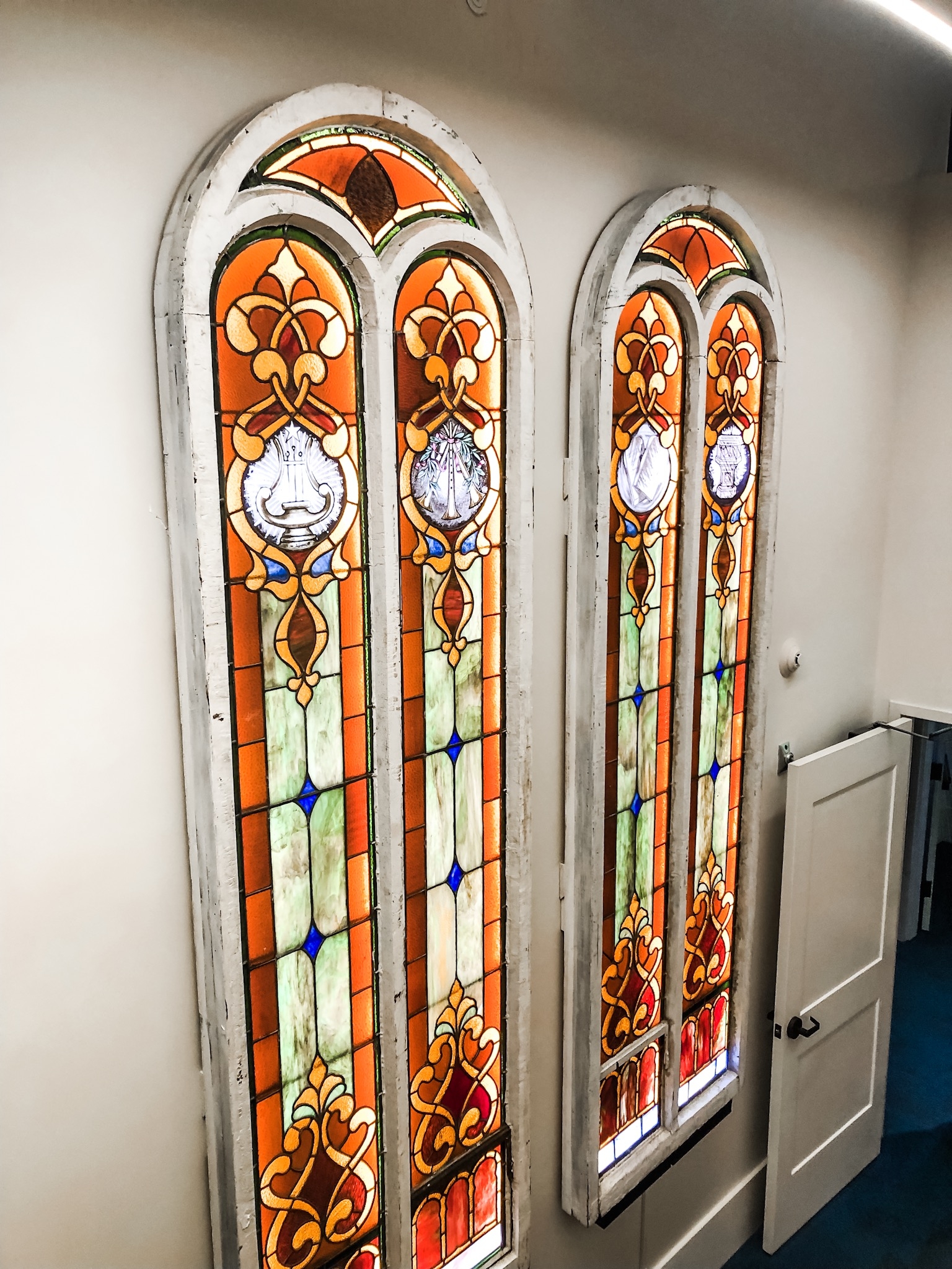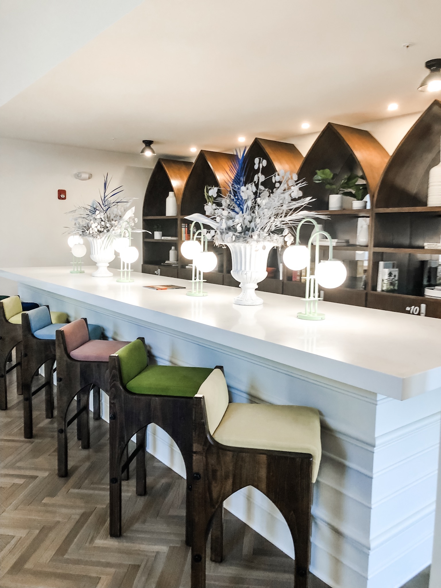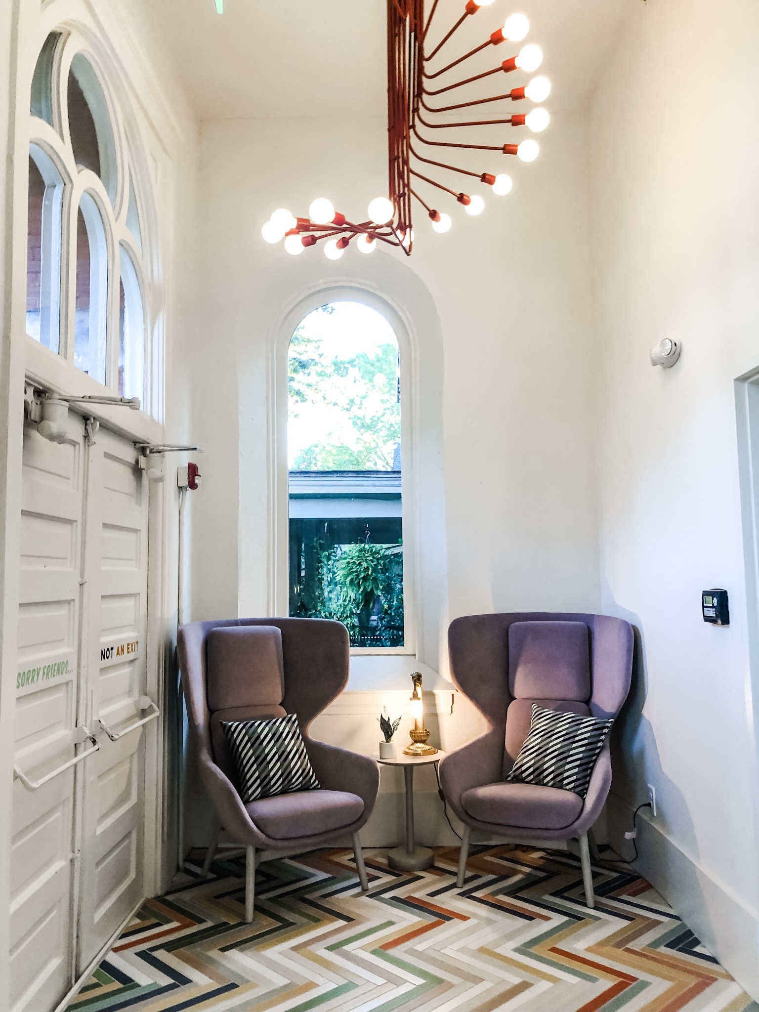 Let’s start with the stained glass windows… just wow. I couldn’t stop taking photos of them every time I was in the lobby. They are truly breathtaking. The retro decor gives such a cool, 70’s vibe that totally flows with The Russell’s East Nashville location.